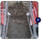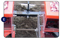 | E. Rear bed former shares A set of reinforced covering blades covers the line sown and simultaneously forms the furrows to improve crop development and subsequent collection. The depth of the furrow is easily adjustable. |