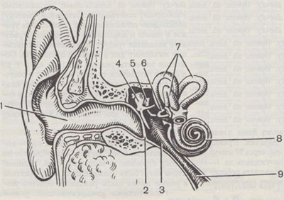 Схема строения уха: 1 — наружный слуховой проход; 2 — барабанная перепонка; 3 — полость среднего уха (барабанная полость); 4 — молоточек; 5 — наковальня; 6 — стремечко; 7 — полукружные каналы; 8 — улитка; 9 — евстахиева труба.